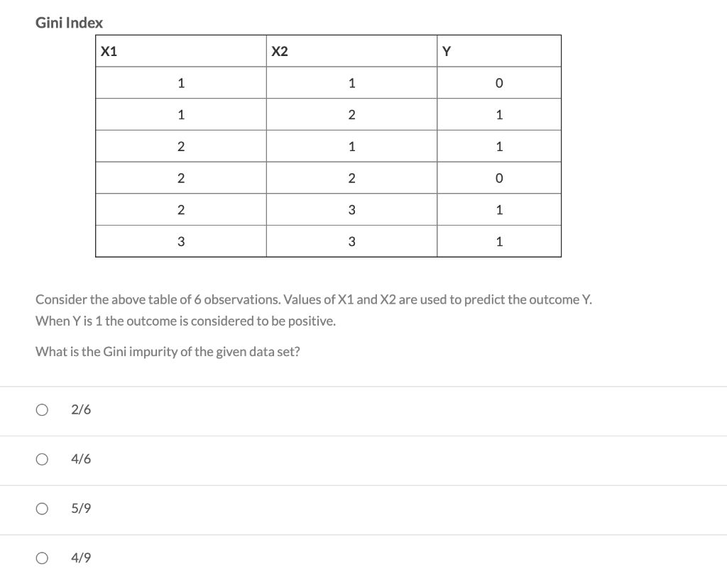Solved Gini Index X1 X2 Y 1 1 0 1 2 1 2 1 1 2 2 0 2 3 1 3 3